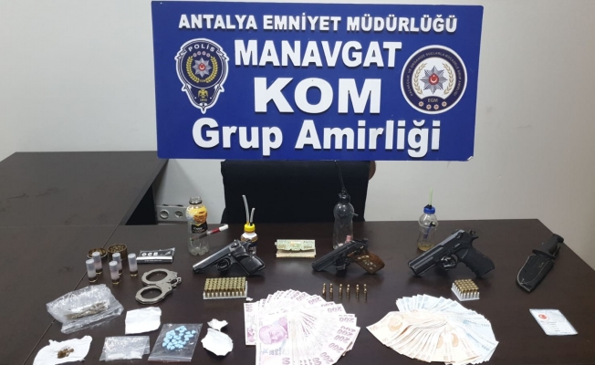 Olay yerinde bulunan A. B. A., S. C ve M. Y isimli şüphelilerin üzerilerinde, çantalarında, araçlar içerisinde ve F. S isimli şahısın evinde yapılan aramalarda, 1 adet 9mm, 2 adet adet 7,65 mm çapında ruhsatsız tabanca, bu tabancalara ait şarşör ve 75 adet fişek, 5 adet dolu av tüfeği fişeği, 29 adet extacy tabir edilen uyuşturucu hap, 3,50 gr. esrar maddesi, 5,50 gr. metamfetamin maddesi, 1 gram uyuşturucu skunk maddesi, 1 adet uyuşturucu öğütme aparatı, 1 adet oluklu kasatura, 1 adet kelepçe, 1 adet sahte ehliyet ve 1 adet sahte nüfus cüzdanı ele geçirildi. Şüphelilerden F. S isimli şahıs hakkında 6136 sayılı kanuna muhalefet, silah ticareti, resmi belgede sahtecilik, uyuşturucu madde ticareti suçlarından, A. B. A., S.C ile M. Y hakkında uyuşturucu madde kullanmak ve bulundurmak suçundan adli işlem yapıldı. Ayrıca GBT sorgulaması neticesinde F. S isimli şahsın kilitlemek suretiyle muhafaza altına alınan eşya hakkında hırsızlık suçundan arandığı tespit edildi. Manavgat ilçe Emniyet Müdürlüğündeki işlemlerin ardından mahkemeye çıkarılan şüpheliler adli kontrol şartıyla serbest bırakıldı.