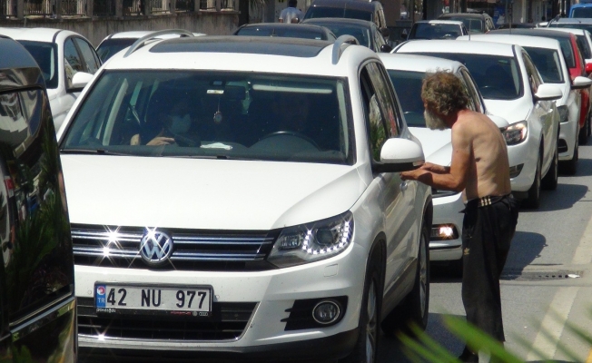 Antalya'nın Manavgat ilçesinde 40 dereceyi bulan sıcak havaya aldırış etmeksizin kırmızı ışıkta bekleyen araç sürücülerinden para ve sigara isteyen, maskesi olmayan ve açık araç camlarından elini sokup insanlara dokunmaya çalışan yaşlı adam polis tarafından güçlükle uzaklaştırıldı. Bunların yanında bir de refüjlere ihtiyaç gideren alkollü yaşlı adama polis bile maskesini taktıramadı. Yaşlı adam cebindeki maskeyle sadece sık sık yüzündeki teri sildi.