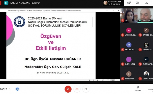 Aydın Adnan Menderes Üniversitesi (ADÜ) Nazilli Sağlık Hizmetleri Meslek Yüksekokulu 2020-2021 Eğitim-Öğretim Yılı Bahar Dönemi Sosyal Sorumluluk Söyleşileri kapsamında düzenlenen ’Özgüven ve Etkili İletişim’ başlıklı söyleşi çevrimiçi olarak gerçekleşti.