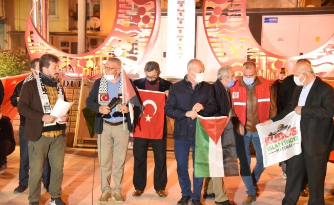 Burhaniye İlim Yayma Cemiyeti Yönetim Kurulu üyesi İsmail Baydemir’in okuduğu basın açıklamasında, İsrail polisinin ve fanatik Yahudilerin yıllardır Kudüs’te işledikleri insanlık suçlarının devam ettiği hatırlatıldı. İnsanlık dışı zulmün Ramazan ayında arttığına dikkat çeken Baydemir, “Ramazan ayında şiddetlenen zulüm tahammül edilemez hale gelmiştir. Mescid-i Aksa’ya saldırılmış, ibadetler engellenmiş, onlarca kişi şehit edilmiş, yüzlerce kişi yaralanmıştır. Bu zulmü yapanlara karşı dünya sadece cılız bir şekilde karşı duruyormuş, karşıymış tavrını takınmakta ve bu tavrını da sürdürmektedir. Bu hal yıllardır olduğu gibi, bu gün de teröristleri cesaretlendirmektedir. Bu gün bu zulüm sadece Kudüs’te Filistin’de değildir. Bu zulüm Yemen’de Afganistan’da, Irak’ta, Suriye’de, Libya’da, Afrika’da daha pek çok İslam ülkesinde devam etmektedir. Bu arada savaşlar, açlık ve yoksulluklar sürmektedir. Müslümanların birbirlerine kırdırılması gözlerimizin önünde cereyan etmektedir. Bu gün Türkiye Cumhuriyeti Devleti, Müslümanları ve İslam Devletlerinin birliği için maddi ve manevi bütün imkanlarını seferber etmiş durumdadır. Bu nedenle biz devletimizin bu husustaki bütün gayretlerini destekliyoruz. Kudüs’te Mescid-i Aksa’ya yapılan zulmü kınıyoruz. Mescid-i Aksa’da zalimlere karşı direnen kardeşlerimizin maddi ve manevi yanındayız, yanında olmaya devam edeceğiz” dedi. Kınama açıklamasına katılanlar tekbirler getirirken, slogan attı. İsrail’i kınama açıklamasına, AK Parti İlçe Başkanı Namık Kemal Gedikoğlu, MHP İlçe Başkanı Murat Kurt, BBP İlçe Başkanı Serdal Filik, İlim Yayma Cemiyeti Burhaniye Şube Başkanı Sadrettin Küçükkaya, Kızılay Şube Başkanı Özcan Kanmaz ve yönetim kurulu üyeleri ile çok sayıda vatandaş katıldı.