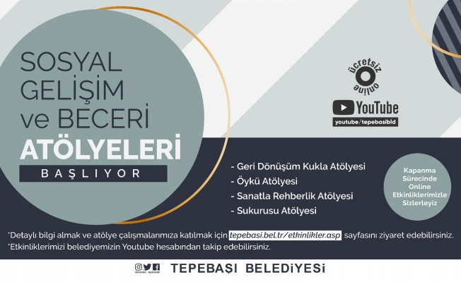 Tepebaşı Belediyesi, pandemi sürecinde gerçekleştirdiği çevrimiçi etkinlikler ile vatandaşlar için hem verimli hem de keyifli aktivite seçenekleri sunmaya devam ediyor. Bu amaçla online olarak gerçekleştirilen Sosyal Gelişim ve Beceri Atölyeleri de tüm yaş grubundan çocuklar için faydalı etkinlikler barındırıyor. Geri Dönüşüm Kukla Atölyesi, Öykü Atölyesi, Sanatla Rehberlik Atölyesi ve Sukurusu Atölyesi, çocuklar için kapanma sürecinde güzel şekilde vakit geçirme imkanı sunuyor. Atölye çalışmaları, Tepebaşı Belediyesi’nin “tepebasibld” adlı Youtube kanalından izlenebiliyor.