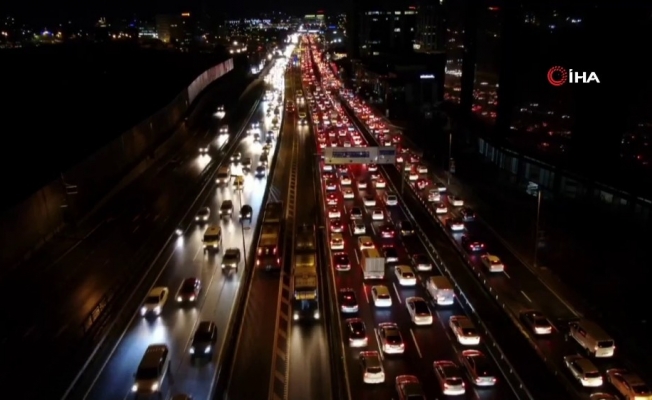 Korona virüs tedbirleri kapsamında hafta içi her akşam uygulanan sokağa çıkma kısıtlamasına saatler kala İstanbul’da yüzde 72 seviyelerine ulaşan trafik yoğunluğu drone ile görüntülendi.