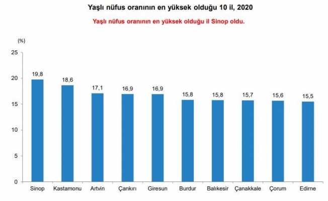 Yaşlı nüfus oranının en yüksek olduğu il yüzde 19,8 oranla Sinop oldu. Sinop’u yüzde 18,6 ile Kastamonu, yüzde 17,1 ile Artvin, yüzde 16,9 oranlar ile Çankırı ve Giresun, yüzde 15,8 oranlar ile Burdur ve Balıkesir, yüzde 15,7 ile Çanakkale, yüzde 15,6 ile Çorum, yüzde 15,5 ile Edirne izledi.