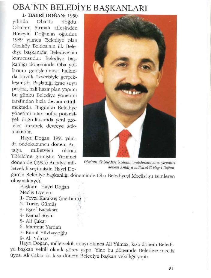 "OLAYLAR İNSANLAR 75. YILINDA ALANYA" kitabının yazarı Araştırmacı Gazeteci Yazar Oğuz Korum, Oba'nın eski Belediye Başkanı ve aynı zamanda Milletvekili Rahmetli Hayri Doğan'a kitabında geniş yer verdi. Alanya ve Antalya bölgesine yaptığı hayati yatırımlar ve ödeneklerle büyük katkılarda bulunan Oba'nın eski belediye başkanı aynı zamanda Antalya Milletvekili Rahmetli Hayri Doğan Abimizi Haber Alanya olarak rahmetle anıyoruz.
