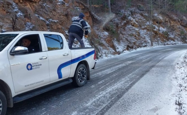 Antalya Büyükşehir Belediyesi, Alanya’nın kırsal yollarının trafiğe açık kalması yoğun çaba gösteriyor. Büyükşehir ekipleri, yüksek kesimlerde tuzlama çalışması başlattı.
