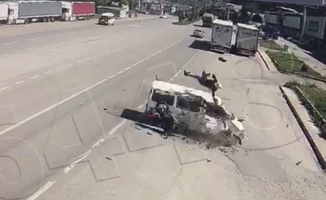 Amasya’da meydana gelen feci kazada minibüsle çarpışan motosikletteki şahıs hızla havalanarak minibüsün üstüne düştü. O anlar çevredeki güvenlik kameralarına saniye saniye yansıdı.