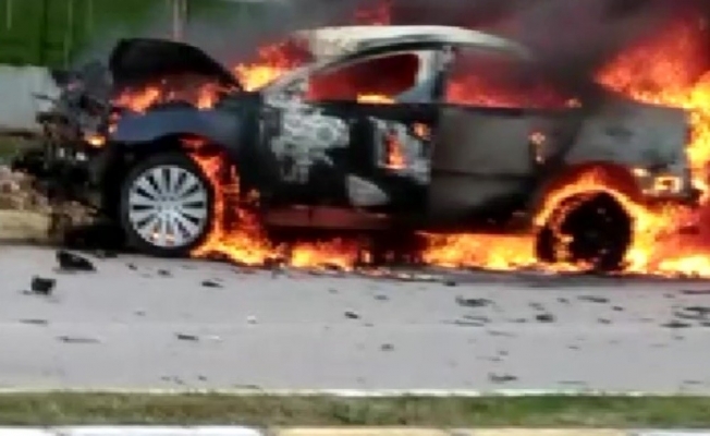 Kamyona çarpan otomobil alev alev yandı