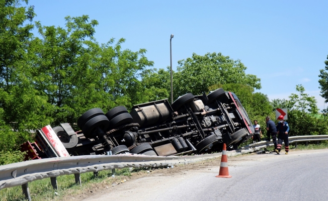Sakarya TEM Otoyolu gişelere bağlantı yolunda sürücüsünün kontrolünden çıkan sebze yüklü kamyon devrildi. Sürücü, kazayı burnu bile kanamadan atlatırken, araçtaki sebzeler ise yol kenarına savruldu.
