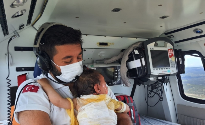 Yanan bebeği helikopter ambulansta hastaneye kadar kucağından indirmedi