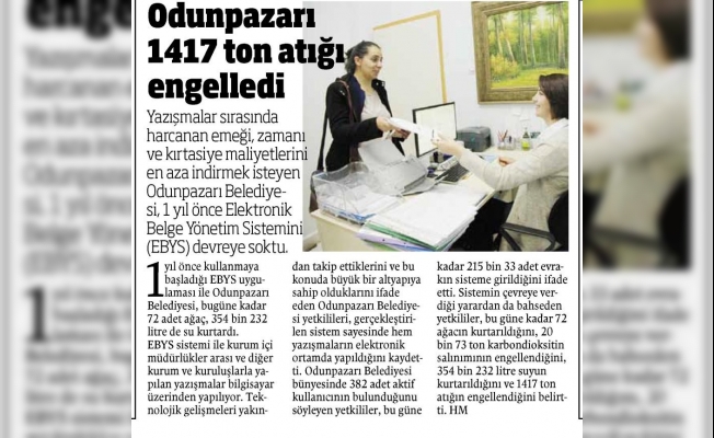 Odunpazarı Belediyesinin yazışmalar sırasında harcanan emeği, zamanı ve kırtasiye maliyetlerini en aza indirmek içim 2015 yılında kullanmaya başladığı Elektronik Belge Yönetim Sistemi (EBYS), artık Türkiye’deki tüm belediyeler tarafından kullanılacak. Çevre dostu uygulama ile diğer belediyelere örnek olan Odunpazarı Belediyesi, 5 yıl boyunca EBYS uygulaması ile yaklaşık 338 adet ağaç, 1 milyon 681 bin 837 kg/Lt su kurtardı. Ayrıca 6 bin 727 ton atık, 95 bin 304 ton karbonmonoksitin üretilmesi engellendi. Kurumsal iletişimin tamamen ağ üzerinde sürdüğü EBYS sayesinde evrakların kaybolması önlenerek dijital bir arşiv de oluşturuldu.